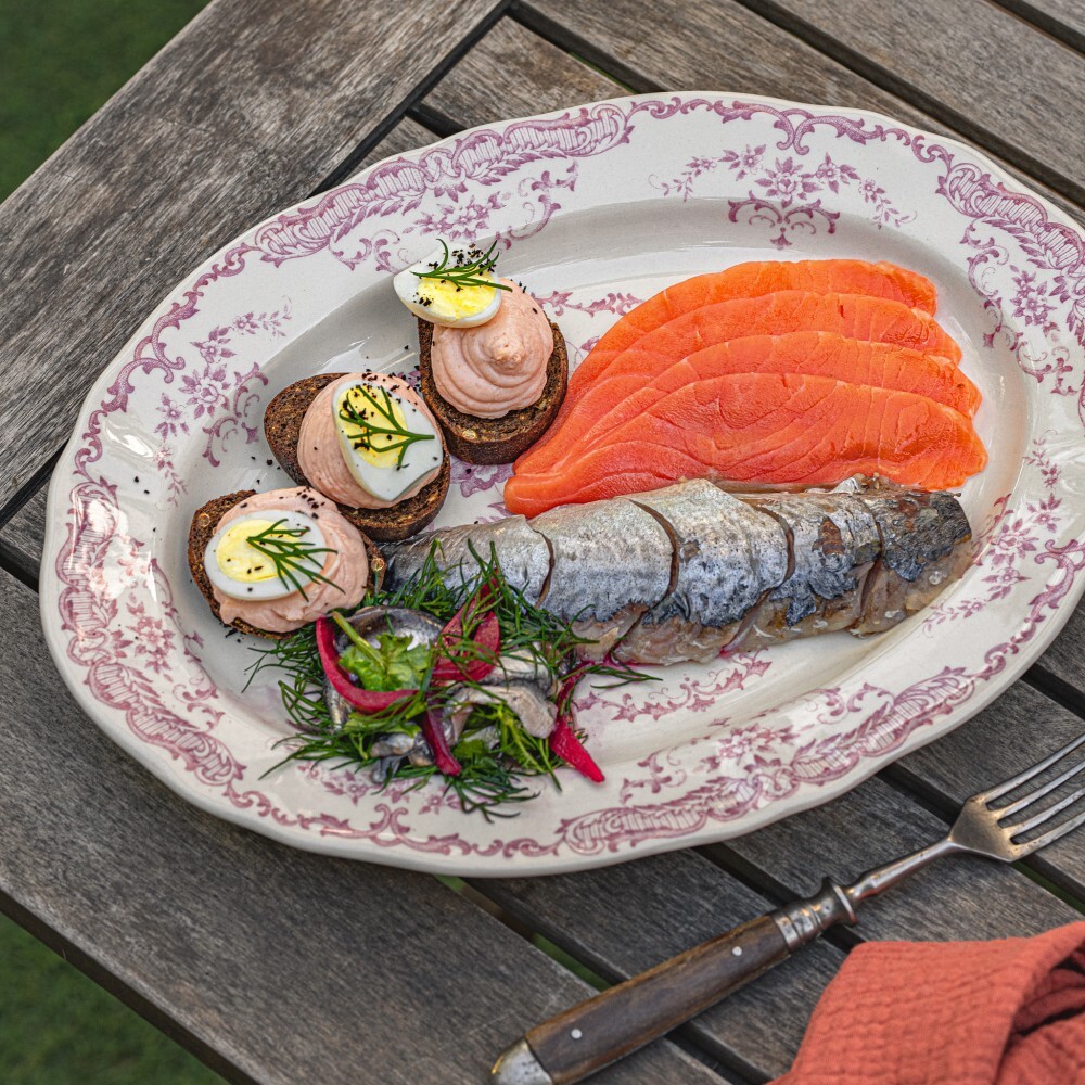 Лосось слабой соли, скумбрия, паштет из лосося, килька, бородинский хлеб, перепелиное яйцо