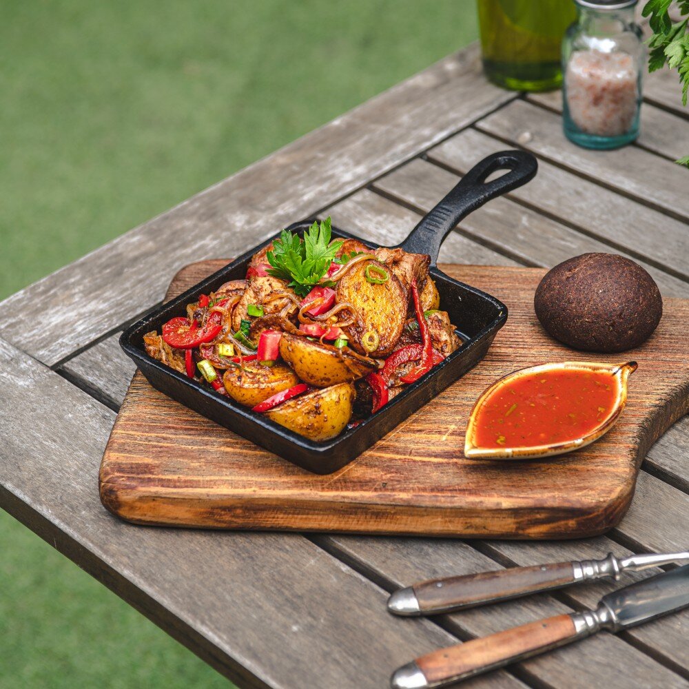 Жаренный молодой картофель, свинина, сладкий перец, томаты, булочка пури