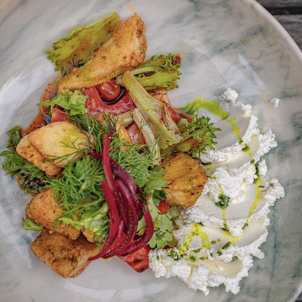 Баклажан, микс салата, томаты, мусс из брынзы