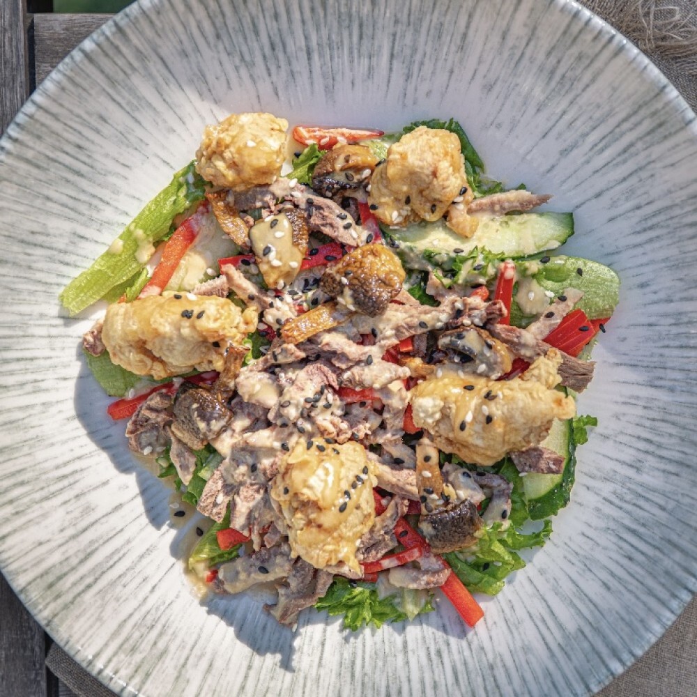 Куриное бедро, телячий язык, огурец, перец, имбирный соус