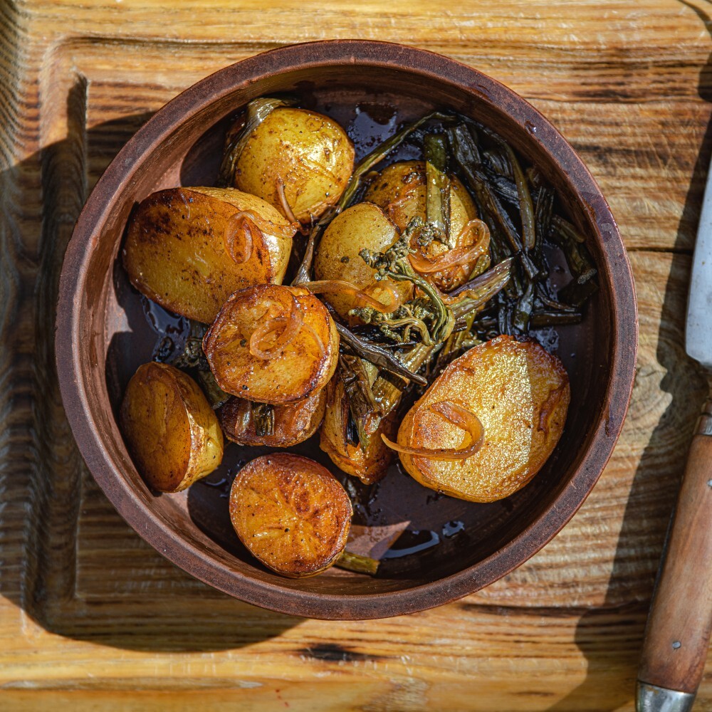 Нежный молодой картофель с обжаренным папоротником и луком. Гарнир с ярким лесным ароматом.